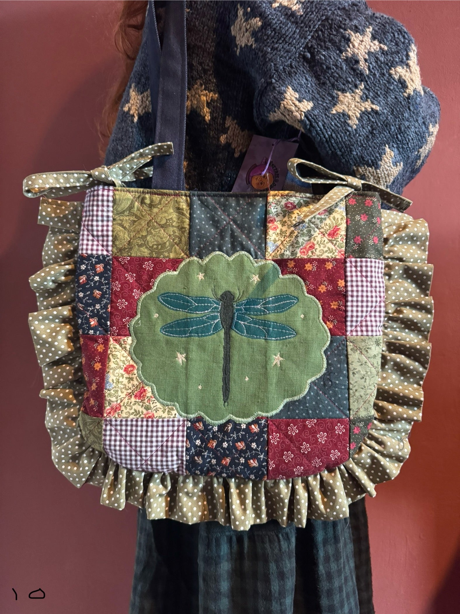 Quilted patchwork frilly one sided bag. Exterior made from high quality quilting cottons, linen, cotton velvets and denim. Interior contains cotton wadding with a poly-cotton blend lining.