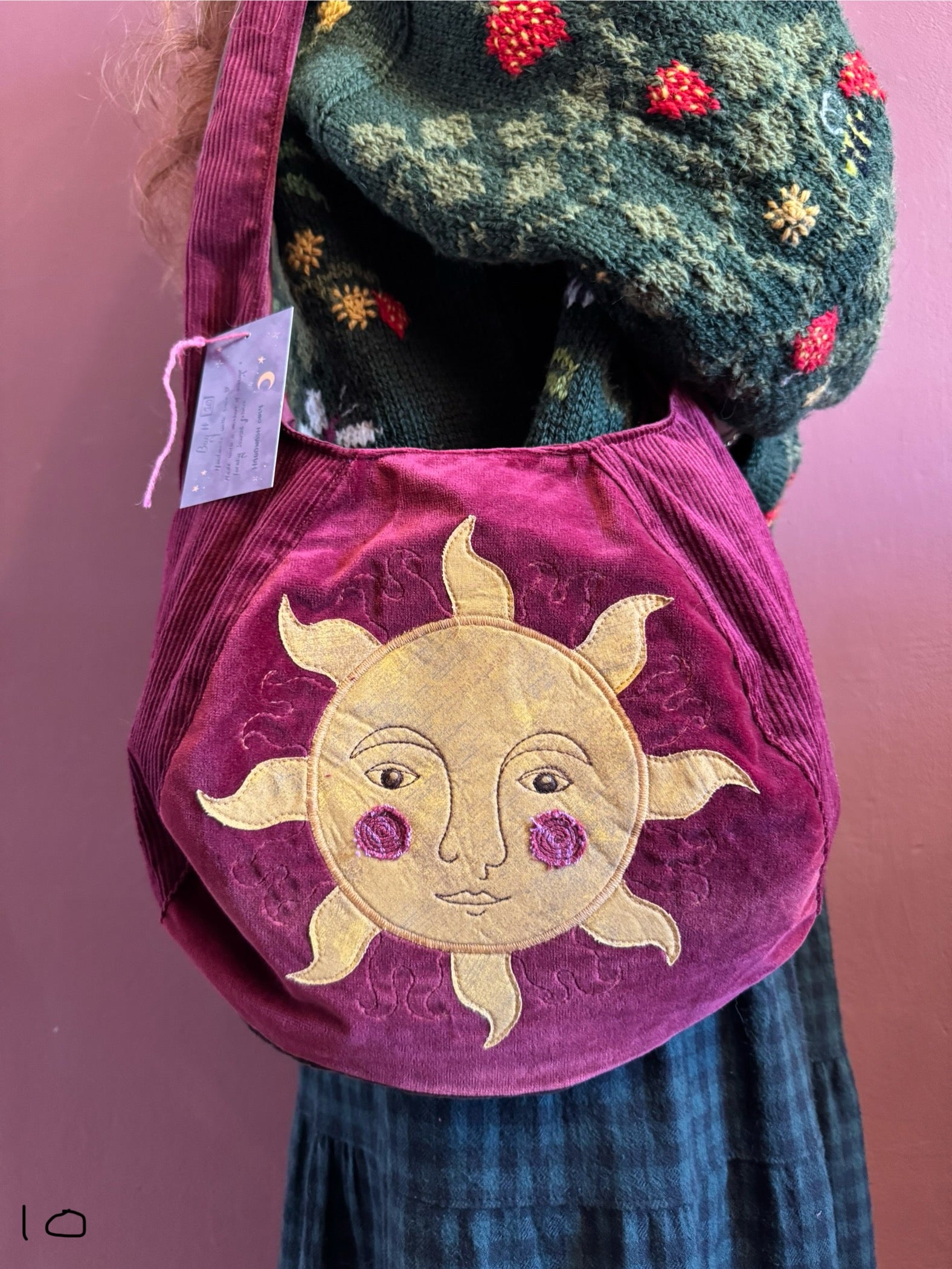 Classic Double sided boho bag with sun and moon design with hand painted stars. This bag has no closure and includes a single pocket.